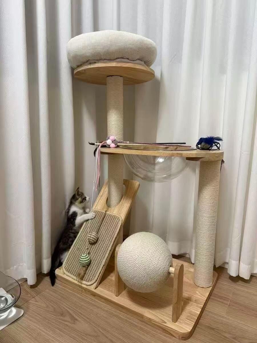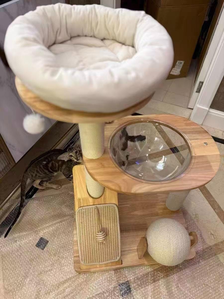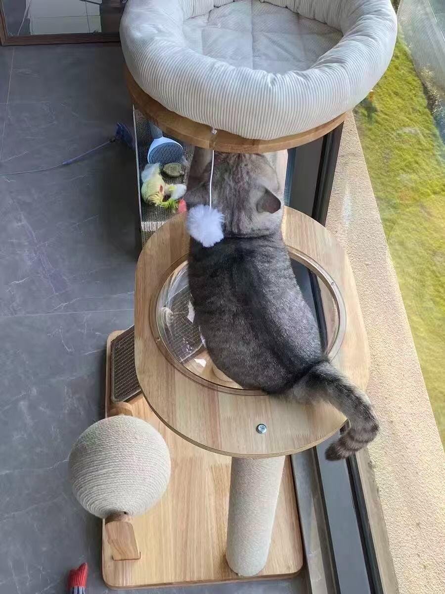 Arbre à chat design en bois naturel clair au style scandinave crème, pensé pour offrir à votre chat un espace stable, confortable et élégant. Idéal pour s’intégrer harmonieusement dans un intérieur moderne.